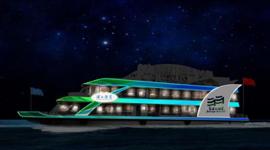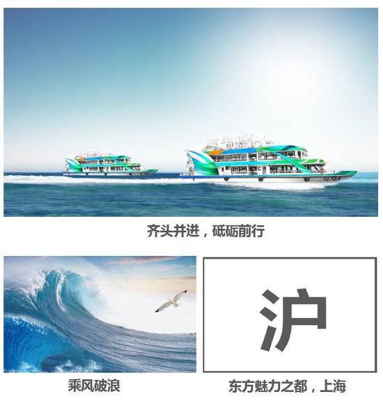 1。整体logo是中文“沪”字的变形,整体图案为两艘游船在黄浦江齐头并进,锐意进取,具有强烈的动感态势及开拓精神。