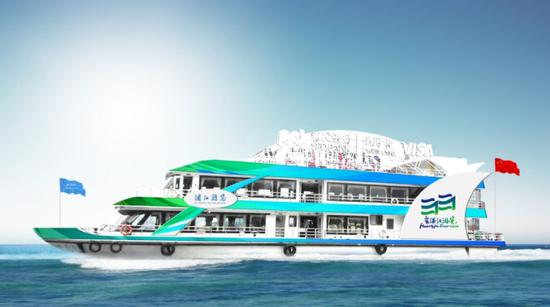 3。蓝天绿水,“美丽中国”,曲线波浪的笔画,代表着黄浦江,一条镌满经典的历史之河,承载着上海走向世界的深厚底韵。