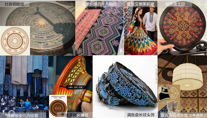 释义:以民族特色纹样整合设计,可涵盖1至56个民族,亦可选单一民族;也可可以融合多民族的主要特点,进行抽象化的整体提炼相关元素,设计成一个整体图案(类似宋锦)等。单个民族设计主要以人口数多的单个大民族为主开发,可以看出单个民族的特性特点;花色设计需要深入挖掘56个民族的文化基因,