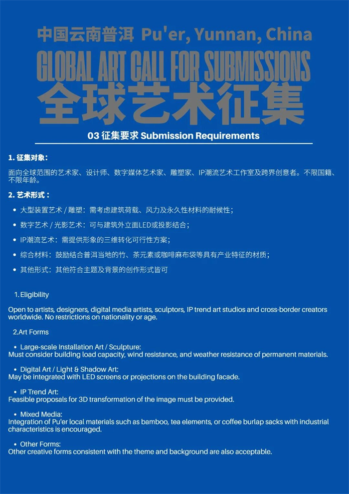 在茶山与雨林之间,让在地文明与当代艺术共生。三向立方当代艺术中心,于云南普洱,向全球创作者发出邀约——寻找“在地文化与当代艺术的融合者”,共同打造一座属于世界的公共艺术现场。生生不息 · 普洱之境 · 在地共生 · 自然与共让艺术落位土地,让场域成为殿堂 普洱,正生长为全球艺术创作圣地。 期待你的作品,成为这片土地的一部分。 Between the tea mountains and the rainforests, let local civilization coexist with contemporary art. ARTON Contemporary Art Center, in Pu'er, Yunnan, extends an invitation to creators worldwide——Seeking 'integrators of local culture and contemporary art' to jointly create a public art space belonging to the world.Endless Life · The Realm of Pu'er, Local Coexistence · Harmony with Nature.Let art settle on the land, let the space become a hall. Pu'er is growing into a global sanctuary for artistic creation. We look forward to your work becoming a part of this land.